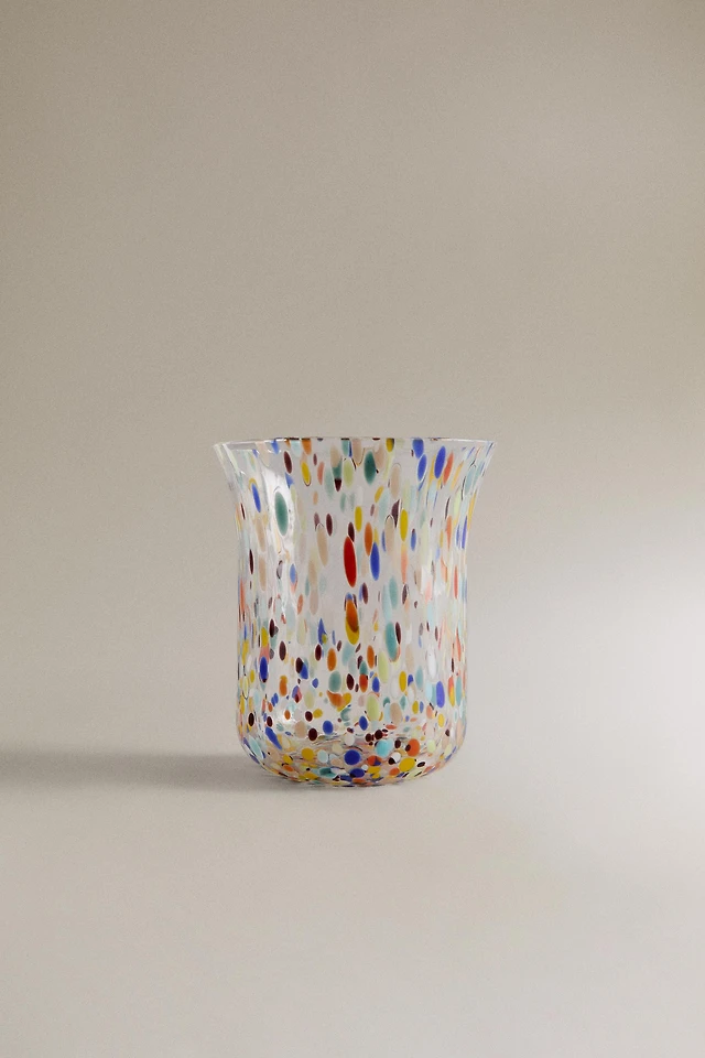 BLOWN GLASS TUMBLER WITH SPECKLED DESIGN