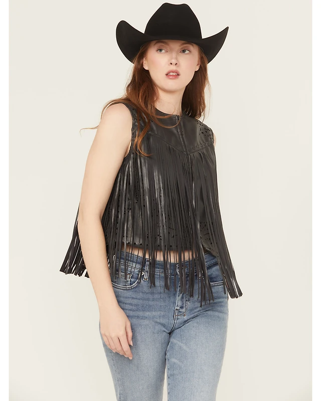 Blue B Women's Faux Leather Bandana Laser Cut Fringe Vest