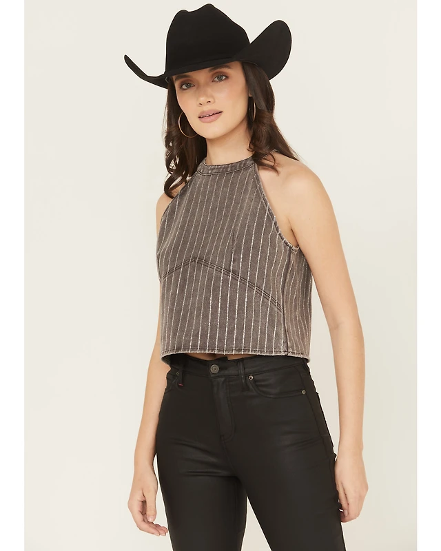 Blue B Women's Sleeveless Rhinestone Striped Halter Denim Top