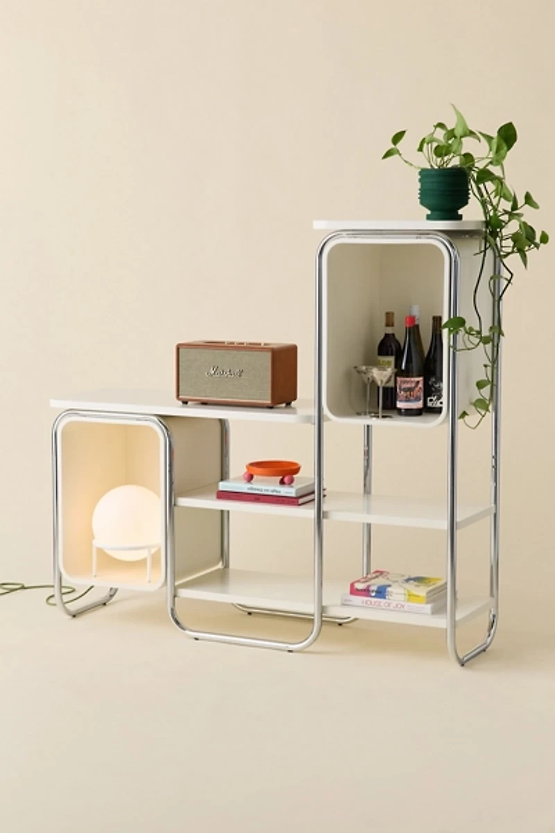 Create a retro-mod space with this storage shelf from our Boden furniture collection. With chrome framing, this shelving unit features a tiered silhouette that creates a dynamic, eye-catching statement in your space. Complete with four shelves and two spacious cubbies, this entertainment console is perfect for displaying your books, speakers and other home decor. Available exclusively at Urban Outfitters.