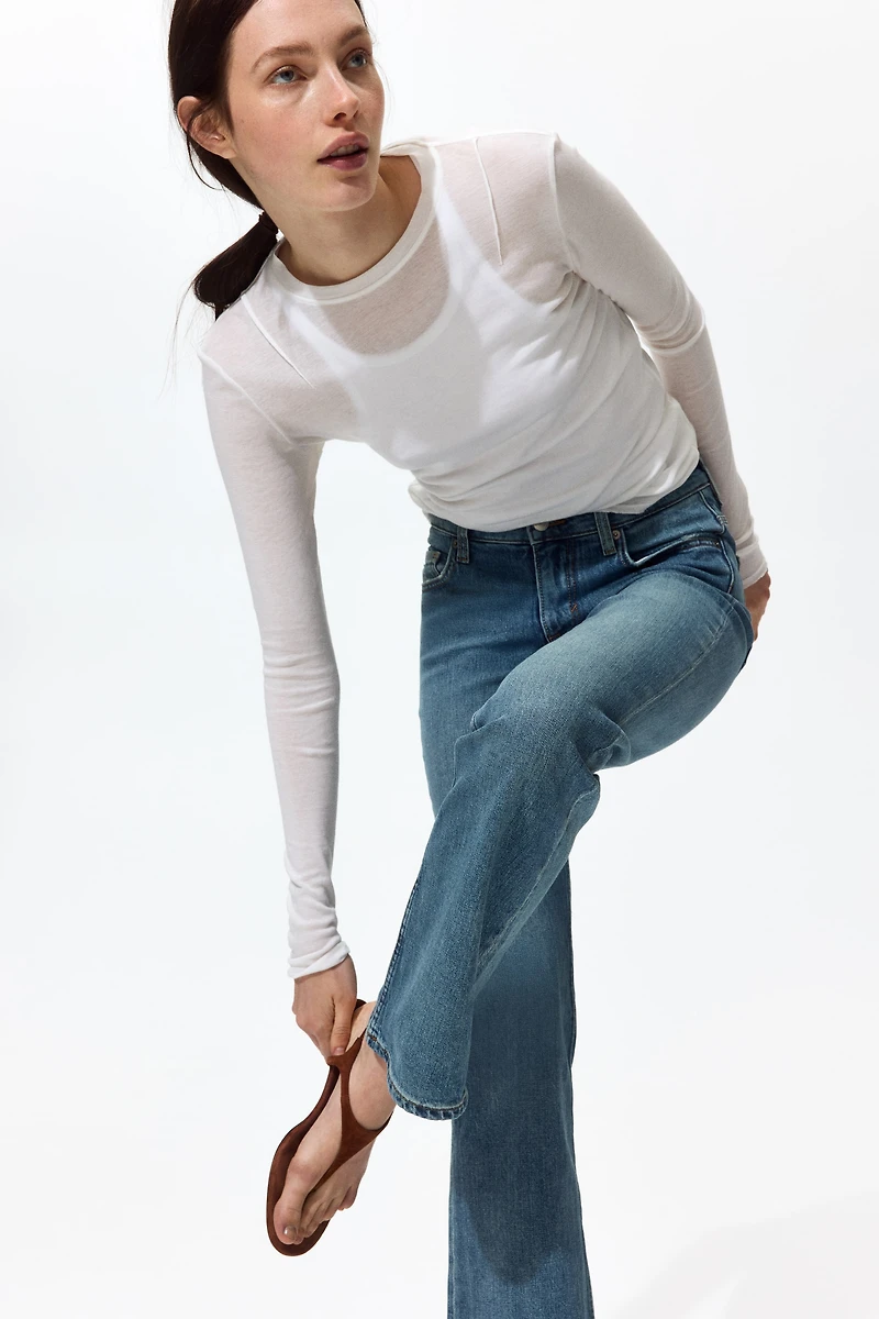 5-pocket jeans in cotton denim with gentle stretch for good comfort. Slim fit from waist to thigh and flared from knee to hem. High waist and zip fly with button. Regular-length bootcut legs, designed to fall at top of foot with little or no stacking.
