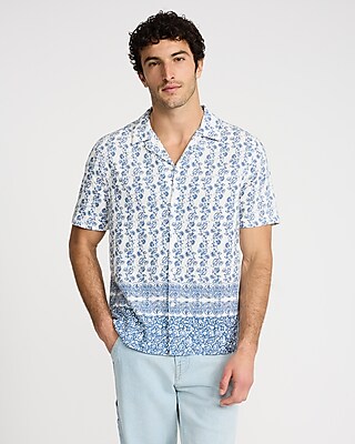 A breathable linen-blend shirt complete with a camp collar, short sleeves, and a bordered floral shirt.