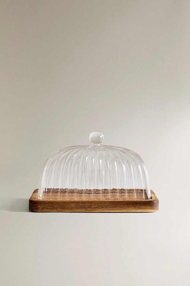 BOROSILICATE GLASS AND WOOD BUTTER DISH