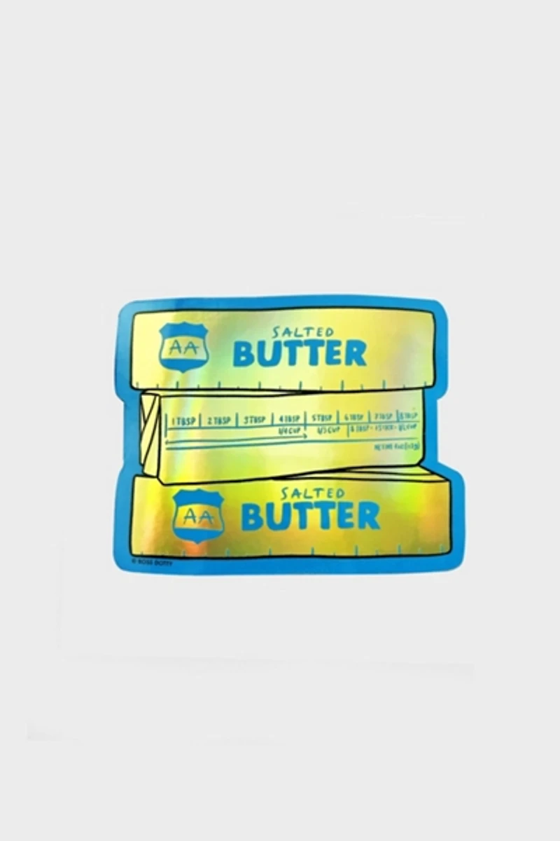 Classic butter stick charm meets holographic gold with this sticker perfect for bakers, home chefs and snack enthusiasts.
