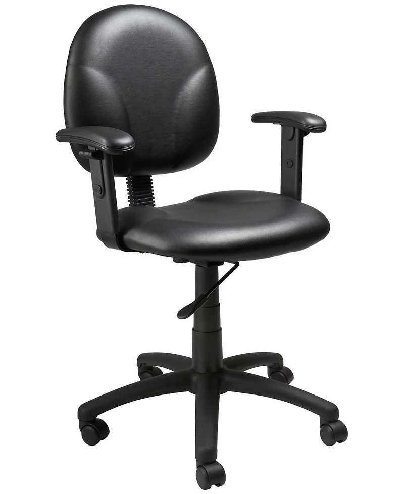 This mid back ergonomic task chair is the perfect way to increase productivity and remain comfortable. Featuring adjustable arms, pneumatic gas lift seat height adjustment, black vinyl upholstery, and adjustable back height and depth for ultimate comfort.