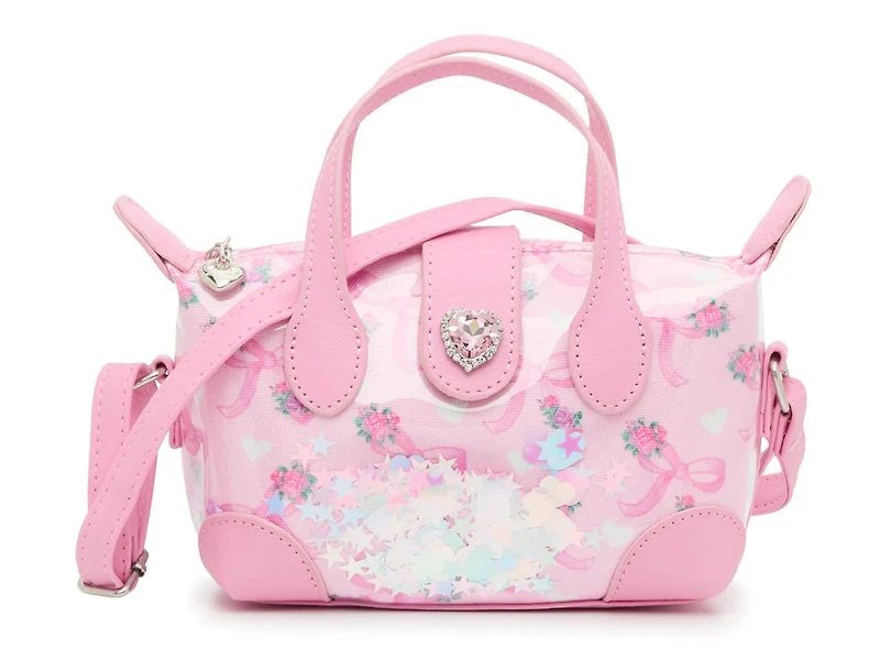 Sweet and sparkly, the Bow Confetti Crossbody Bag from OMG Accessories is perfect for adding playful flair to any outfit. Designed with a pastel bow-and-heart print, this adorable bag features a clear front filled with star-shaped confetti that moves with every step. Finished with a jeweled heart accent snap and top handles, it’s a whimsical way to carry everyday treasures.