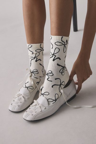 Coquette cozy socks with an allover bow print. Lightweight-yet-cozy knit in a crew length.