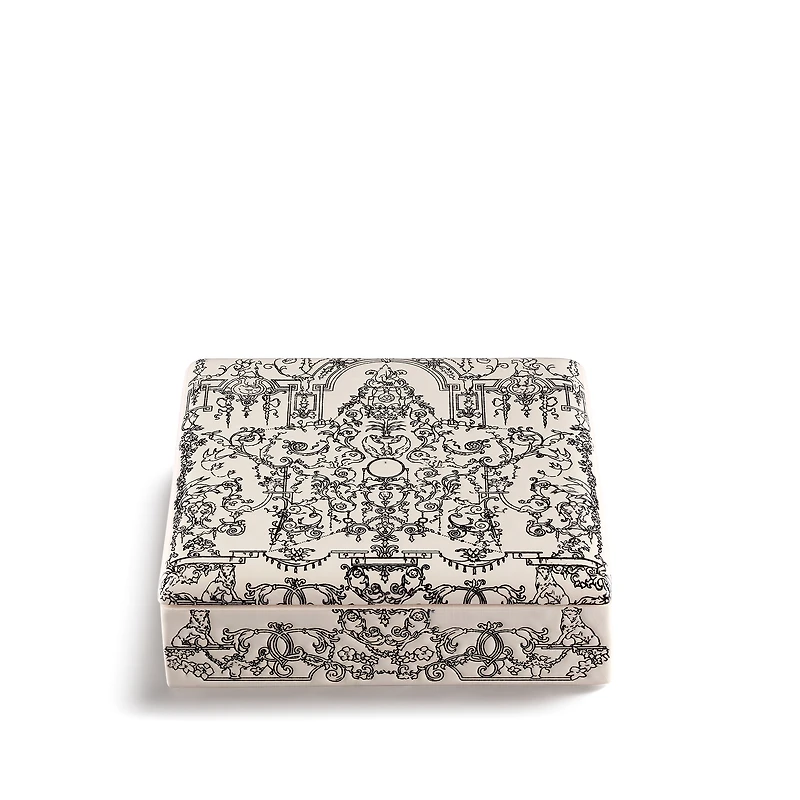 Unveiled as part of Dior Maison's exclusive holiday collection, the box is inspired by the fascinating portrayal of baroque theater in the Dior Cruise 2026 Fashion Show. Handcrafted in ecru ceramic and enamel in collaboration with the Manufacture des Émaux de Longwy, the box is adorned with a whimsical star embellished with delicately rendered swirls and designs in deep black hues, creating a graceful, dreamlike tableau. The processes used, from the initial creation to the ultra-precise enameling, display outstanding execution. The creation will bring an extra touch of luxury to the home during this festive time of year, and can be paired with other pieces from the line for a magical and poetic setting.