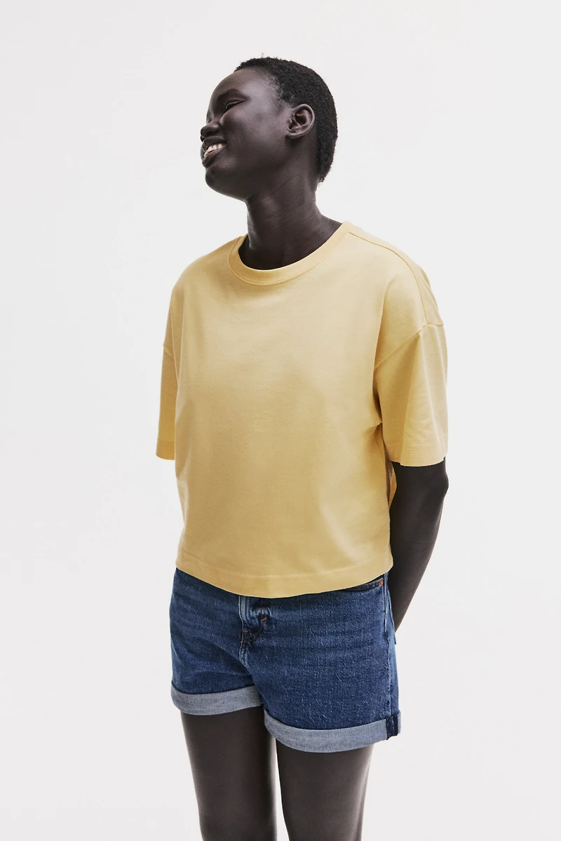 Boxy, loose-fit T-shirt in soft cotton jersey. Crew neck, dropped shoulders, and elbow-length sleeves. Straight-cut hem.
