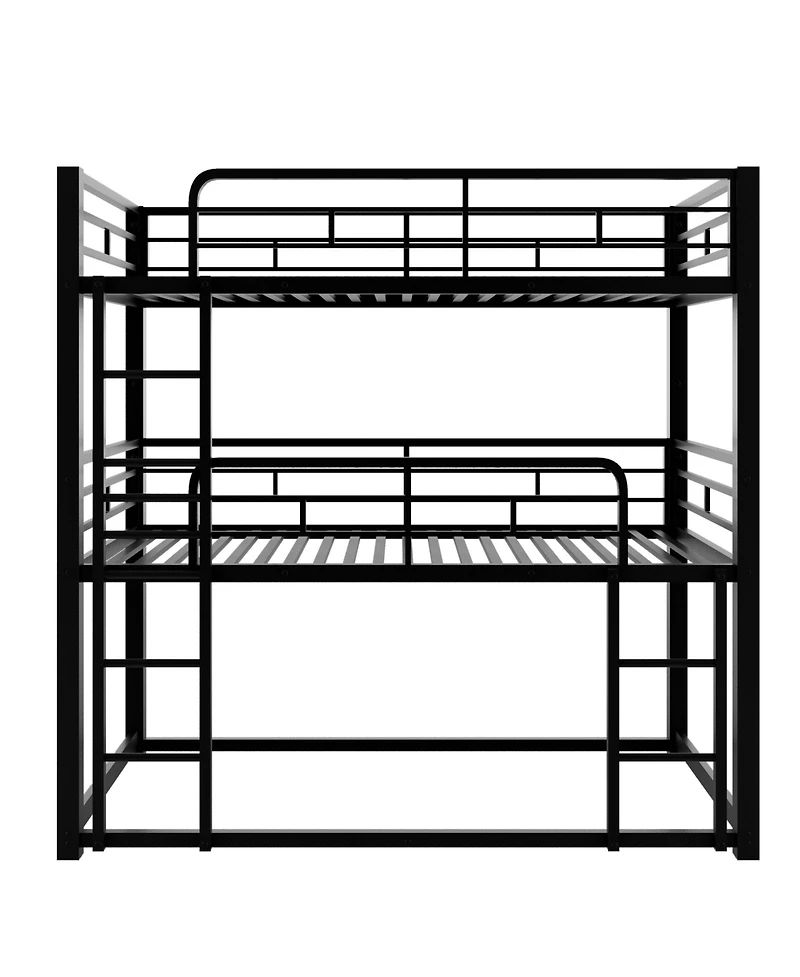 This triple bunk bed is perfect for family which has multiple members. Bunk design is space-saving and two ladders are attached to bed which provides easy access to top bed and middle bed. Constructed with heavy duty metal, the stacking three beds is securely strong and steady. Equipped with easy access slat guardrails keep your members snug and secure. With space-saving design and sturdy construction, this bed will provide great experience.