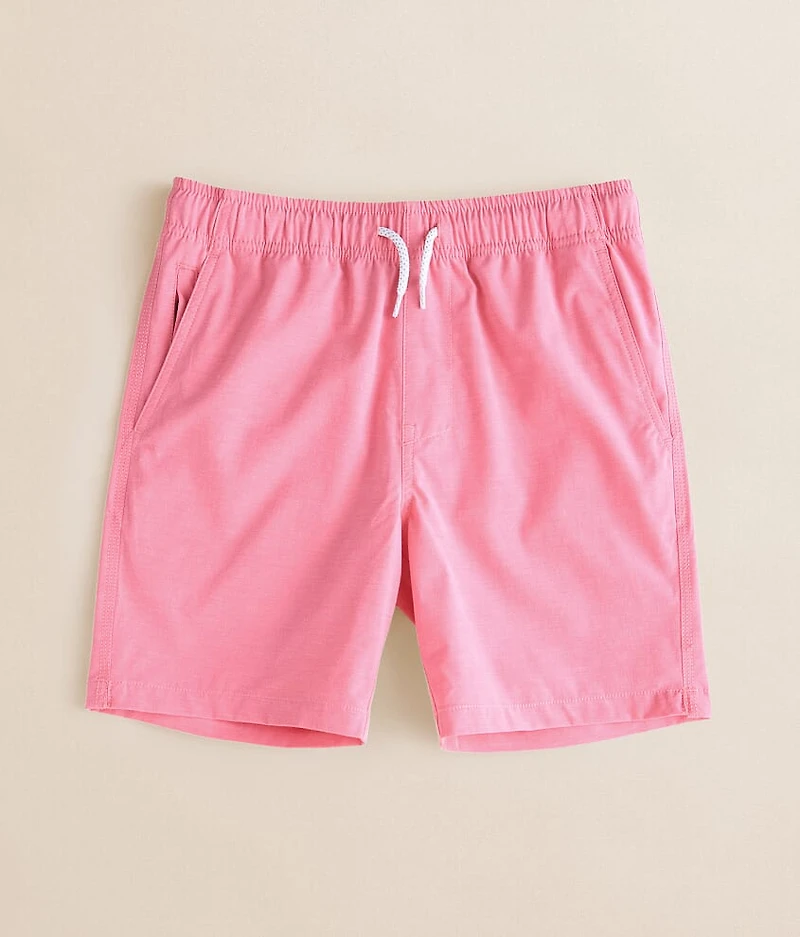 Unlined short 10" rise 6" inseam Elasticized cinch tie waistband Side seam and back welt pouch pockets Matching men's walkshort