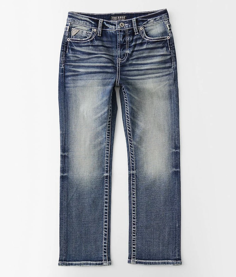Relaxed fit knit jean Performance stretch fabric for a higher level of flexibility Regular inseam measures 27" on size 12 and will grade accordingly to size Tall inseam measures 29" on size 12 and will grade accordingly to size Straight from knee to hem Adjustable waistband Mid-rise, 14" bottom opening Embroidered faux flap back pockets Hand sanding, whiskering and grinding details Zip fly Sizes 4-6 have snap closure