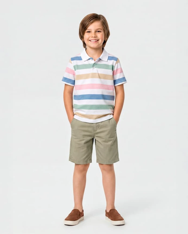 Classic style meets everyday ease in these boys shorts. Made from soft, naturally breathable cotton, they’re built for comfort all season. Featuring an adjustable waistband, pockets and durable fabric, these kids shorts are a must-have pick.FABRICATION: 100% cotton twill body, 100% recycled polyester pocketing, importedFIT & DESIGN: Classic fit, mid rise, above-knee lengthCLOSURE: Button with zip fly, inner adjustable waist tabsFEATURES: Soft hand feel, kid-perfect comfort, everyday durability, naturally breathable cotton, belt loops, side-slant & back welt pockets, fabric finished for added softness & to reduce shrinkage