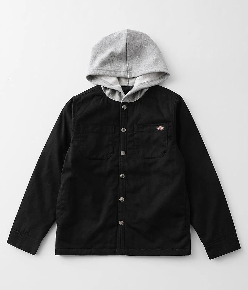Snap front lined shirt jacket Fleece lined knit hood Side seam hip pockets
