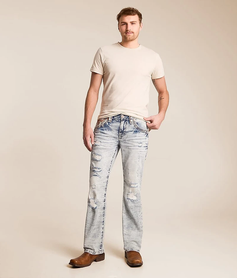 Slim fit bootcut jean Comfort stretch fabric Low rise, 18" bottom opening Studded faux flap back pockets Destruction and denim backing details Zip fly