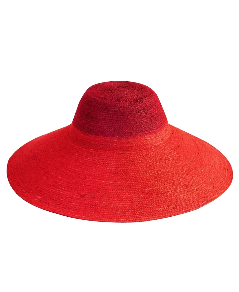 Riri 'Duo' handwoven straw hat is perfect for packing on your next tropical vacation. It's made from the union of nude and tangerine orange jute straw colors that are bold yet versatile. Made by our female artisans in Bali from natural handwoven jute straws, it has a sculpted crown and a brim that shields it from the sun.DETAILSDimension: Brim 6 inches approximatelyComposition: 100% Natural JuteHandwoven in Bali, designed in CaliforniaColor: Red and maroon brim
