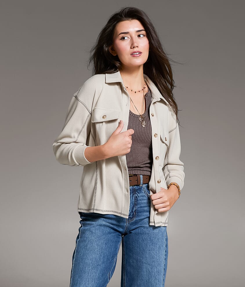 Button down shirt Contrast stitch details Soft and cozy fabric Bust measures 47" on size small Body length 25" on size small