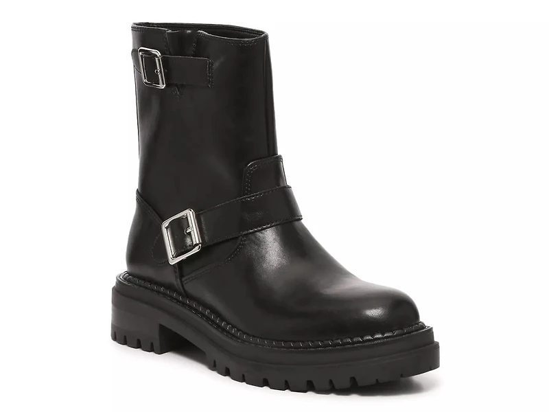 Need to release your teenage angst? Do it through your style! The leather Brycin moto bootie from Steve Madden features edgy accents, including a durable lug sole and eye-catching buckle details.