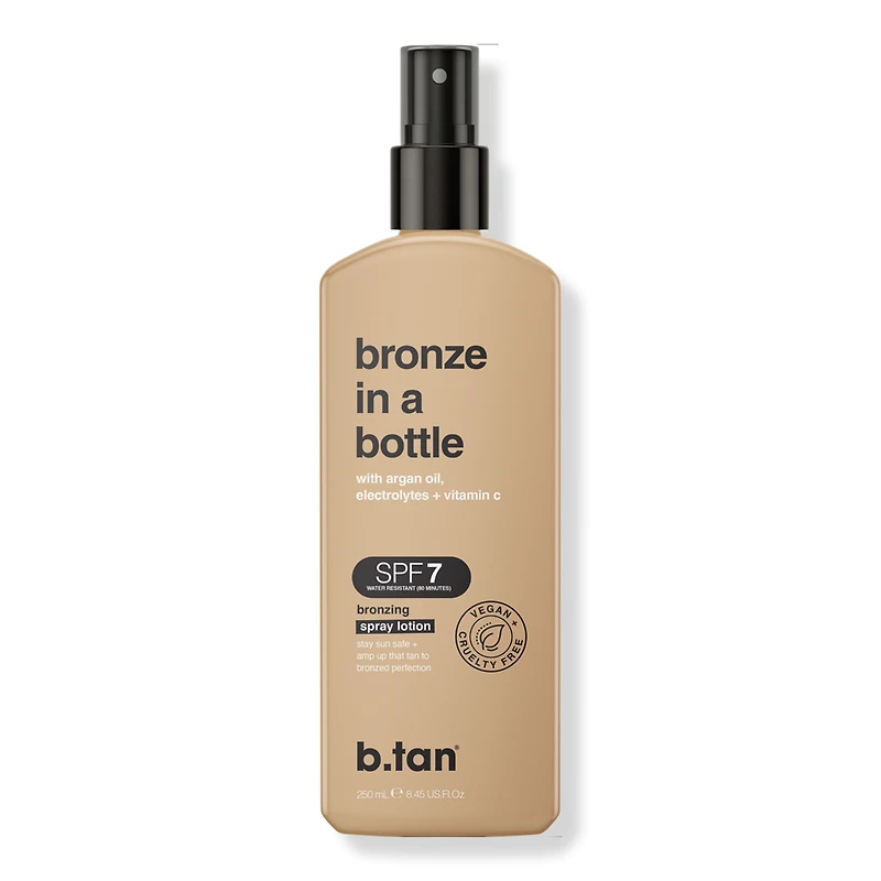 B.TAN BRNZ BOTLE SPF 7 8.45 FL OZ 8.45OZ. Benefits: Tinted for an instant touch of tan. SPF 7 for a sun safe time. Key Ingredients: Argan Oil. Electrolytes. Vitamin C. :
