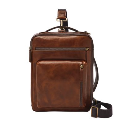 This leather commuter features 1 padded laptop pocket, 1 pen holder, 1 back slide pocket with snap closure, 1 adjustable & detachable shoulder strap, and 1 back luggage strap with 2 handles. Fossil leather products support responsible manufacturing via the Leather Working Group.