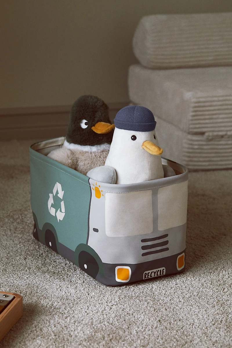 All aboard the tidiness express with this storage basket in cotton canvas with a printed bus motif. Wire at upper edge to help basket keep its shape. Height 7 3/4 in. Width 7 3/4 in. Length 13 3/4 in.