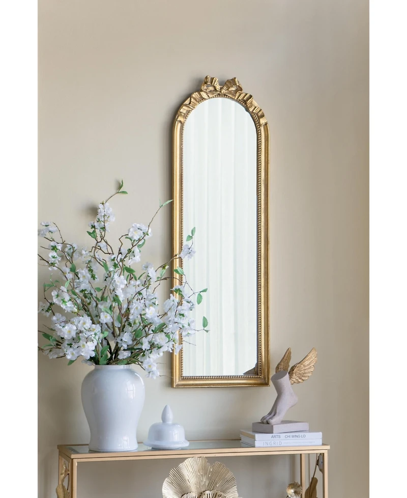 This 15.8" x 48.8" full-length mirror features a Baroque-inspired arched design with a gold finish and elegant scrollwork crown.High-definition glass offers a clear reflection, brightens rooms and expands visual space. It fits modern, traditional and French Country decor perfectly.Made of 60% Mdf, 30% mirror and 10% resin, it weighs 14.3 lbs and makes a timeless statement piece for entryways, bedrooms and living rooms.
