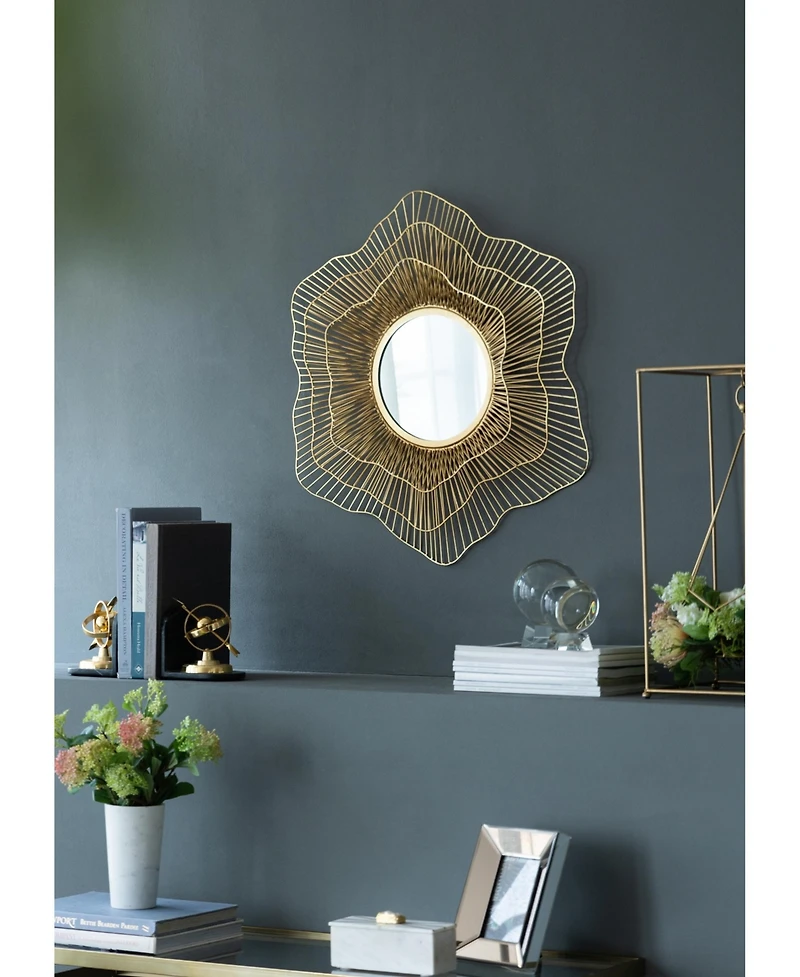This D27" round wall mirror features an eye-catching starburst flower metal frame design, ideal for entryways, hallways, bathrooms and living rooms.Crafted from 70% iron and 30% glass, it measures 27x27x2.4 inches with an 8"x8" mirror center and weighs 7.9 lbs.