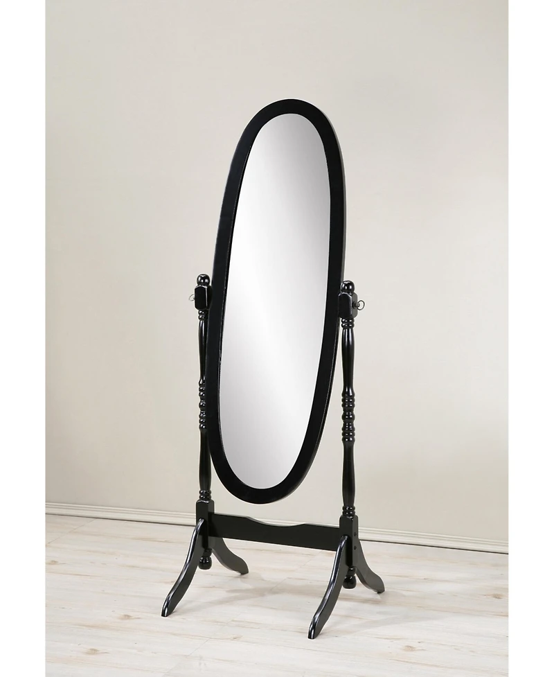 This traditional Queen Anne style cheval mirror in a sleek black finish is the perfect accent for classic home decor, blending timeless elegance and daily functionality.Featuring an elongated oval mirror with a sturdy wooden frame and stand, this freestanding design swings smoothly between delicate turned posts, allowing you to tilt it freely for clear full-body reflections. Curved bracketed feet and a stabilizing stretcher between the legs enhance stability and prevent wobbling.Overall Dimension: 22.5W x 16D x 59.25H inches, ideal for bedrooms, dressing rooms and entryways.Kindly note: Monitor display differences may cause slight color variations between the product photo and the actual item.