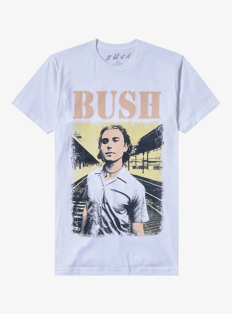 Wear the face of Bush, Gavin Rossdale, wherever you go with this tee showing a pastel portrait of the singer and the band name in pastel. Please note: Style runs large; size down for a tighter fit.