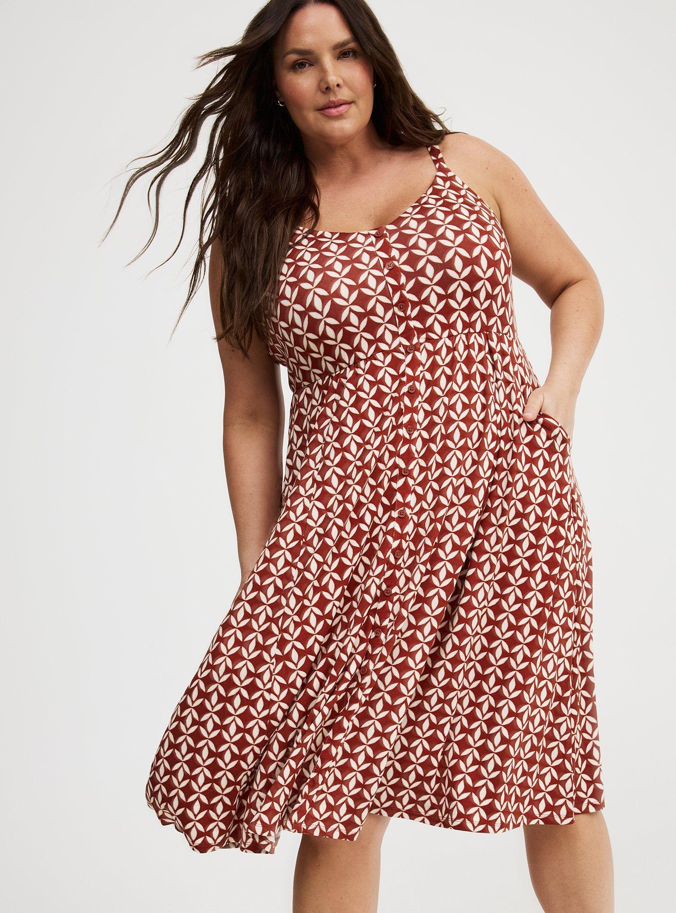 FIT Adjustable straps. Elastic waist. Midi length. Measures 48'' from shoulder (size 2). MATERIALS + CARE Super Soft knit fabric: An incredibly soft, versatile knit that hugs close to the body. Stretch level: Maximum. 95% rayon, 5% spandex. Machine wash cold. Line dry. Imported. DETAILS Scoop neckline. Sleeveless. Faux button front. Functional pockets.