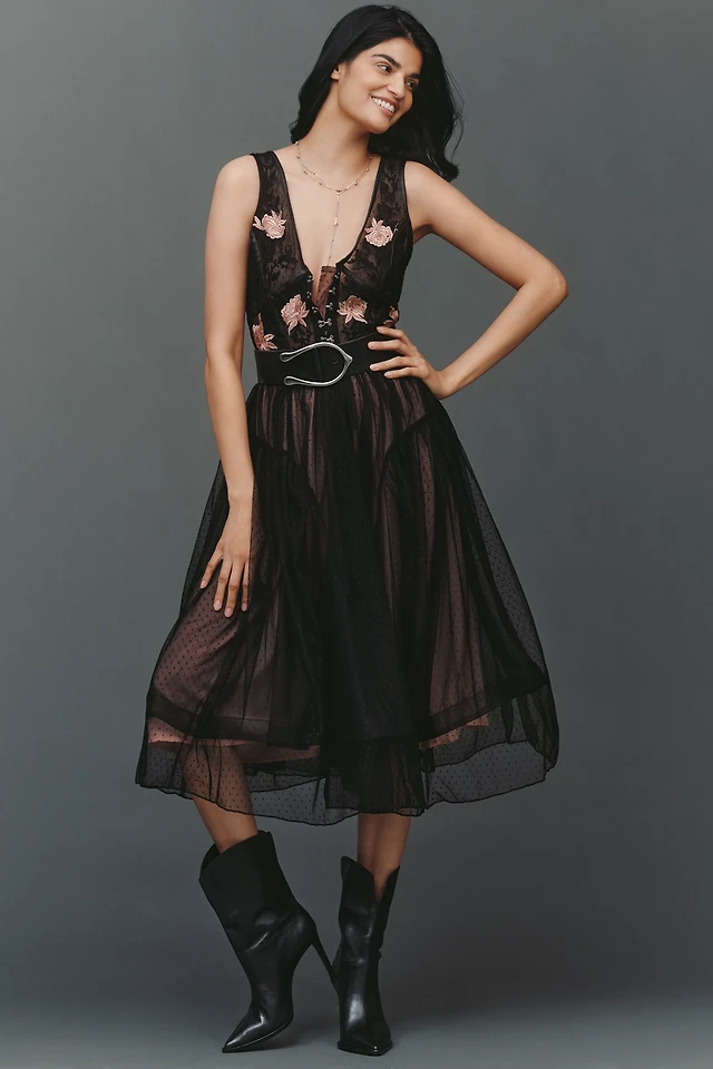 BHLDN Sleeveless Lace Corset Ruched A-Line Midi Dress