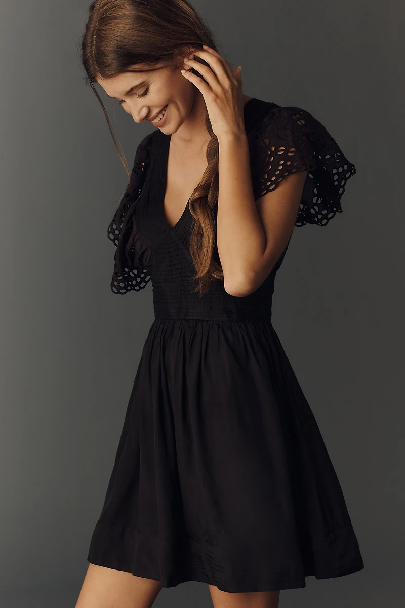 By Anthropologie Eyelet Flutter-Sleeve V-Neck Mini Dress
