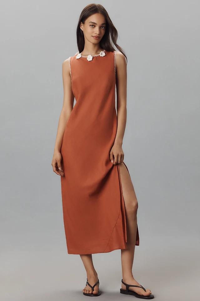 By Anthropologie Linen Blend Sleeveless Crochet-Trim Midi Dress