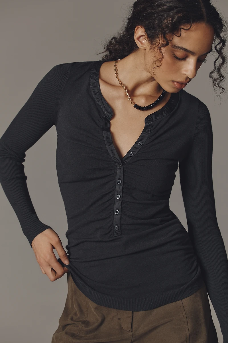 By Anthropologie Ruched Satin-Trim Henley Sweater