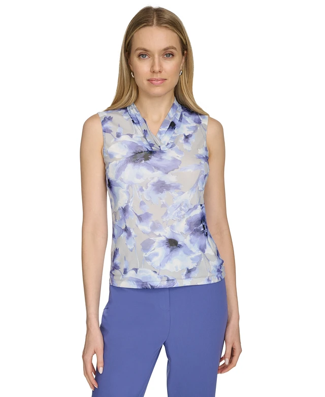 Calvin Klein Petite Printed Pleated V-Neck Sleeveless Top