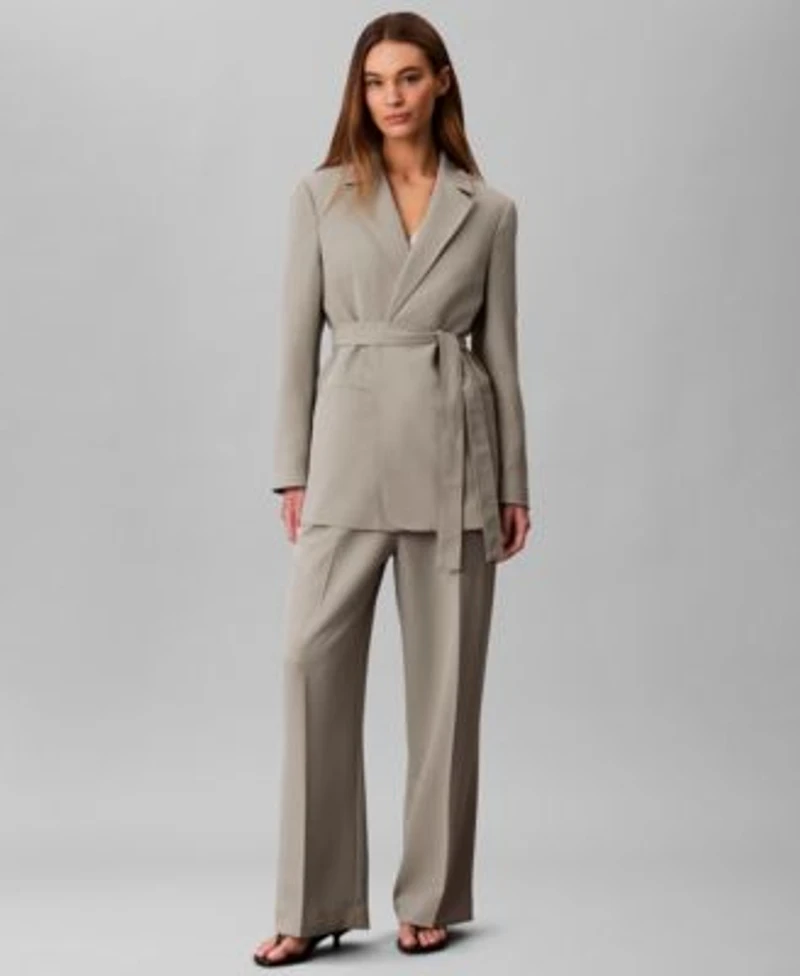 Elevate your everyday look with this Calvin Klein belted blazer, a modern silhouette with classic proportions, featuring sleek notch lapels, long sleeves, and a self-tie belt at the waist. Side welt pockets and a single vent at the back add functional details, while the fully lined interior ensures comfort and refinement.