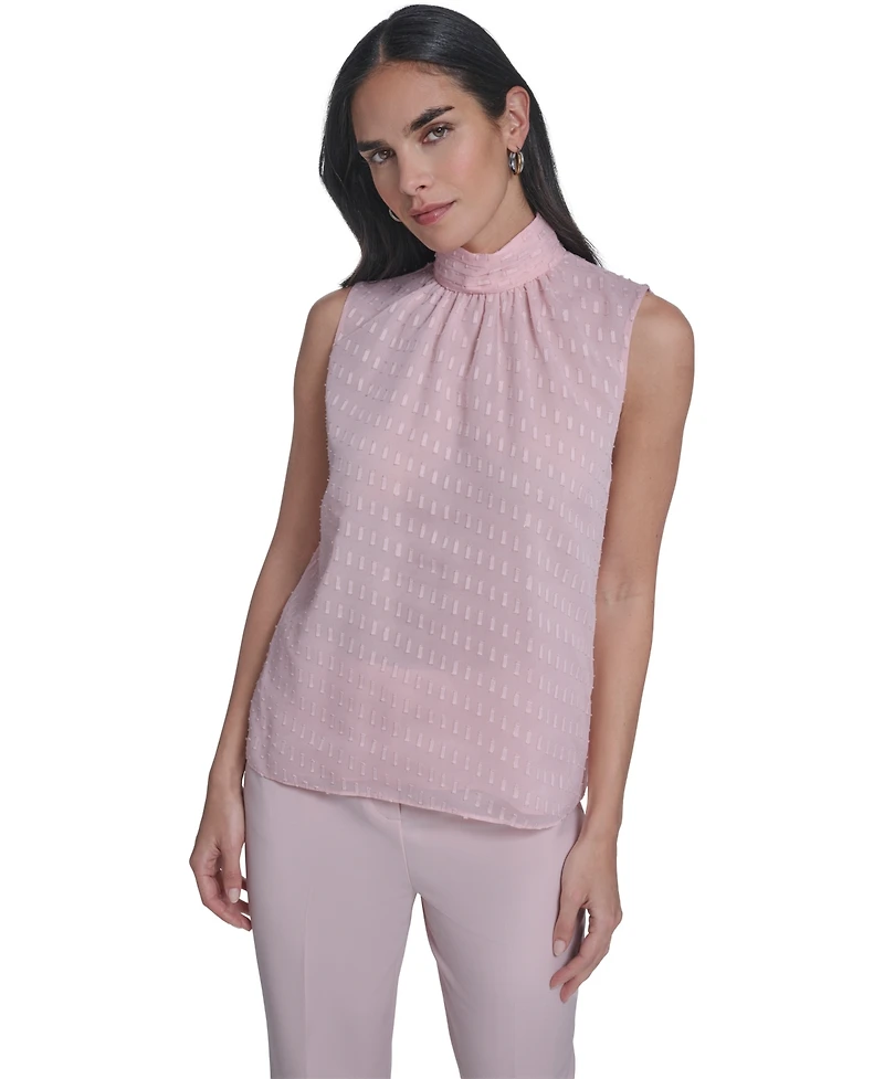 Make modern detail the focal point with this Calvin Klein sleeveless top, showcasing a clip-dot pattern and sleek mock neckline. A back keyhole with button closure completes the textured look.