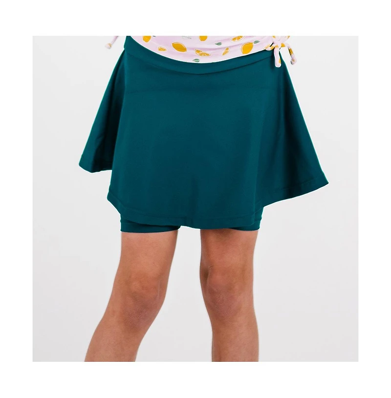 Discover versatile comfort in our Girl's Midi Swim Skort! Quick-dry fabric, Upf 50+ protection, and a convenient layer over a bikini bottom. Rinse, machine wash cold, and air dry for lasting wear. Crafted from 82% Nylon, 18% Spandex, and a gusset of 100% Polyester.