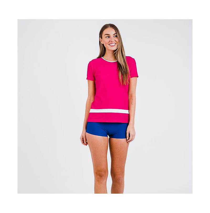 Dive into style with our Short Sleeve Color Block Rash Guard. Relaxed fit and round neckline. Size up for the best fit. Quick-drying with Upf 50+. Wear it over your favorite swim bra. Rinse and lay flat to dry. Make a splash this summer with protection and style!