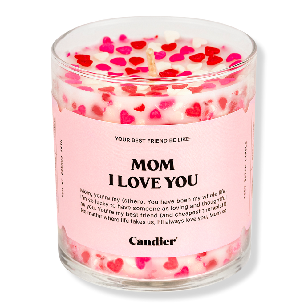 MOM I LOVE YOU CANDLE 9.0OZ. Features: 100% natural soy wax. Handmade in the USA. 60+ hours burn time. Formulated Without: Carcinogens. Parabens. Phthalates. Key Notes: Peach. Apple. Cherry Blossom. Hydrangea. Powder.