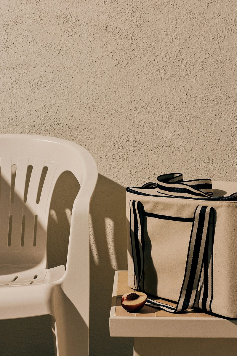 Cooler bag in cotton canvas with accent-color details. Two jacquard handles at top, an adjustable shoulder strap, and a spacious compartment with a two-way zipper. Small open compartment at front. Thermal lining.