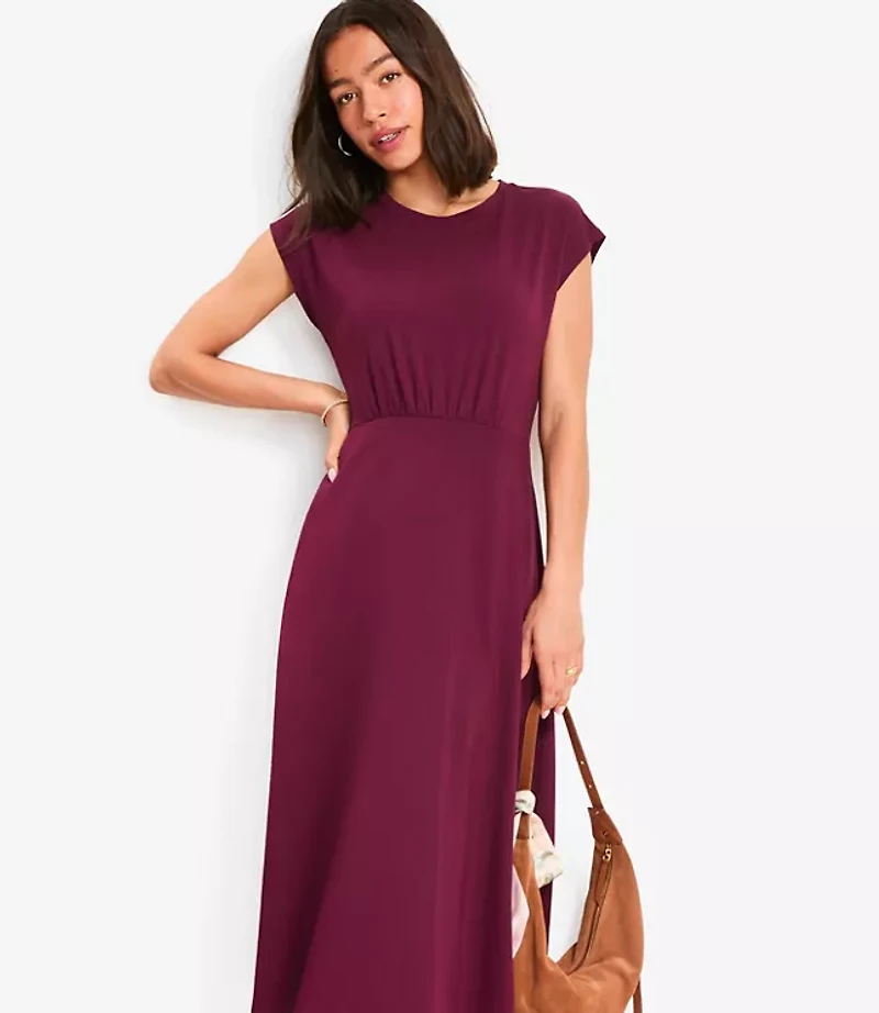 In a super soft knit, this midi dress is modern - minimalist perfection made easy ( and flattering ). Crew neck Cap sleeves Elasticized waist Onseam pockets Button back slit., Imported:, Fit: Waisted - fits and flatters waist, Length: 47 3/4"from top back edge to hem, measured from a size 8 / M, Fabrication: 57% Cotton 38 Modal 5 Spandex, Exclusive of Elastic, Garment Care: Machine Washable Loft Cap Sleeve Midi Pocket Dress Size Medium Smoked Garnet Women's by Loft Size Regular - M Smoked Garnet Women's Fit, & Flare Dresses Everyday 57% Cotton 38% Modal 5% Spandex Exclusive of Elastic Machine Washable