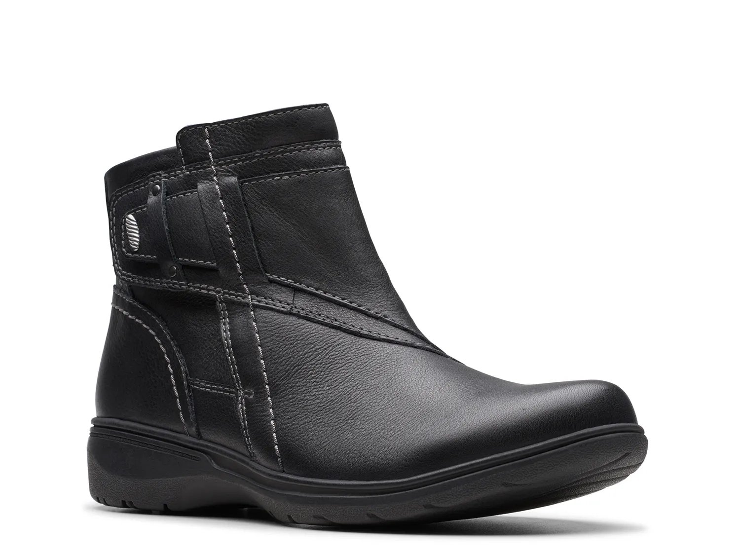 The Clarks Carleigh Style bootie is a seasonal essential. The leather bootie comes is designed with contrast stitching details that stand out. Its fabric sock, lining and Ultimate Comfort footbed take care of your comfort needs. Also, its classic strap closure provides a secure, personalized fit.