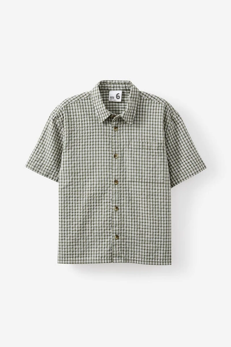 A laid-back short-sleeve for warm days and cool kids. The Carter Skate Shirt brings an oversized fit, button-up closure, and checkered print in safari green. Made with cool cotton feel for all-day comfort while they play. Easy with jeans, easy with shorts, easy with just about everything else in their wardrobe.