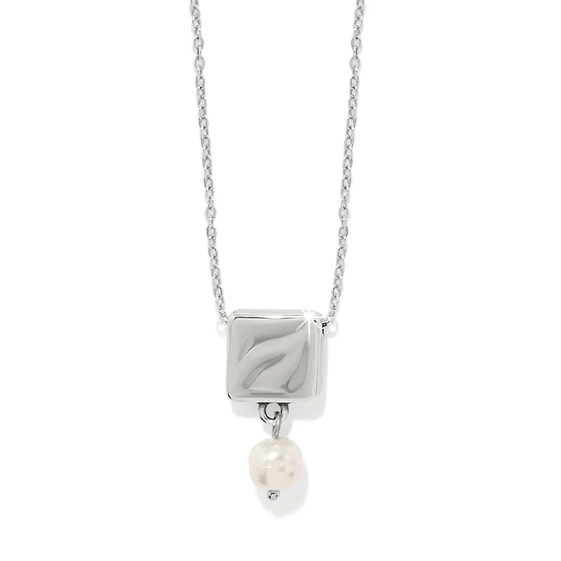 A new square shape comes into the mix in Cascade. The delicate fluidity continues inside the square shape and an 8mm Baroque white pearl drops beautifully from the pendant.