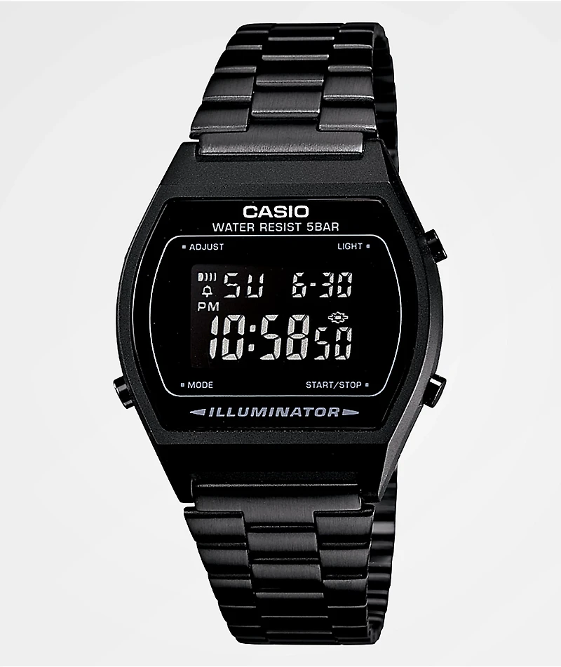 The Casio B64OWB-1BVT Vintage watch offers a sophisticated look with a sleek vintage design. The all black stainless steel digital watch features a squared case and 5-link band as well as provides all the necessary functions you need like a digital time d
