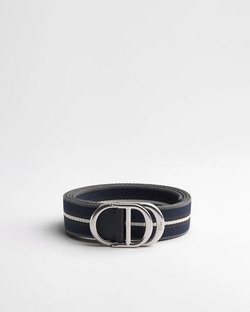Unveiled as part of Jonathan Anderson's debut collection for the House, the CD belt showcases a contemporary aesthetic, becoming a new essential in any modern wardrobe. The deep blue nylon strap with three-tone stripes is embellished with an emblematic antique silver-finish brass CD buckle. Featuring an adjustable length, the 35-mm (1.4-inch) belt can be tied with style to elevate any casual silhouette.