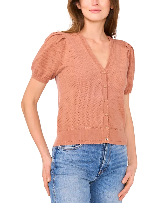 CeCe Women's Pointelle-Stitch Short-Sleeve V-Neck Cardigan