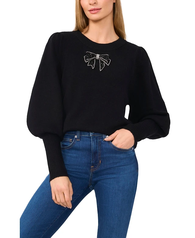CeCe Women's Rhinestone Bow Crew Neck Sweater