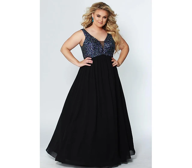 Sydney's Closet Women's Fitted V-neck Spaghetti Strap Plus Evening Gown
